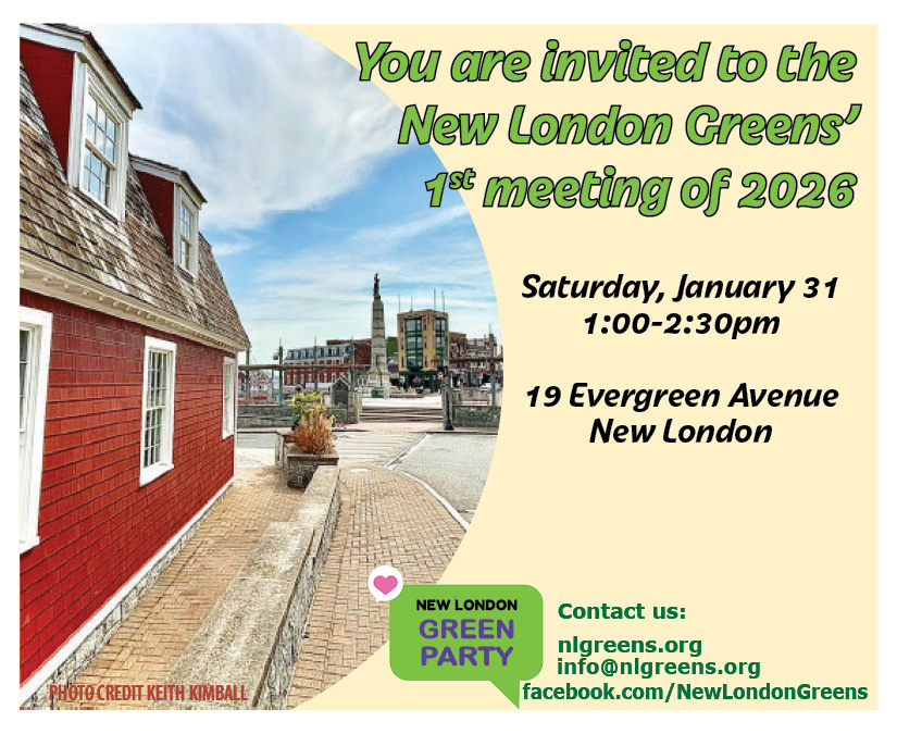 The New London Green Party's first meeting of 2026 will be held on Saturday, January 31, 1:00-2:30pm, at 19 Evergreen Avenue. This in-person meeting will give us the opportunity to socialize and debrief after last fall's elections, set goals and strategize for the coming year, and elect officers and town committee representatives. We welcome all who'd like to learn more about us or are interested in working cooperatively with our members.